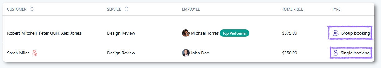 As explained in Pricing and duration, appointment type depends on the maximum capacity of the service. If the maximum capacity is 1, the appointment is treated as a single appointment and is always booked for one person only. If the maximum capacity is higher than 1, the appointment becomes a group appointment and can hold multiple customers in the same time slot.