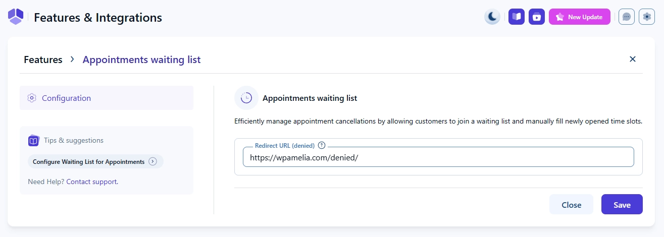 To enable Appointments waiting list, go to Amelia → Features & Integrations → Features and activate the feature by clicking the Enable button.