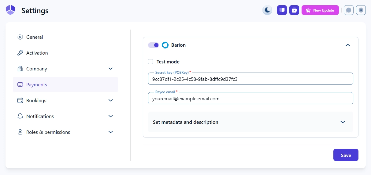 - Paste it into Amelia → Settings → Payments → Barion → Secret key (POSKey).