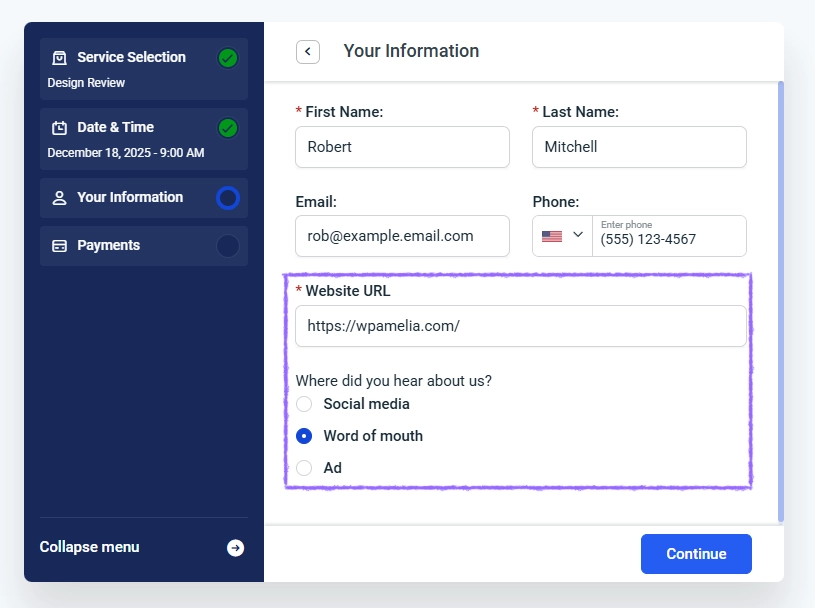 Amelia supports multiple field types that let you collect different kinds of customer input during booking.