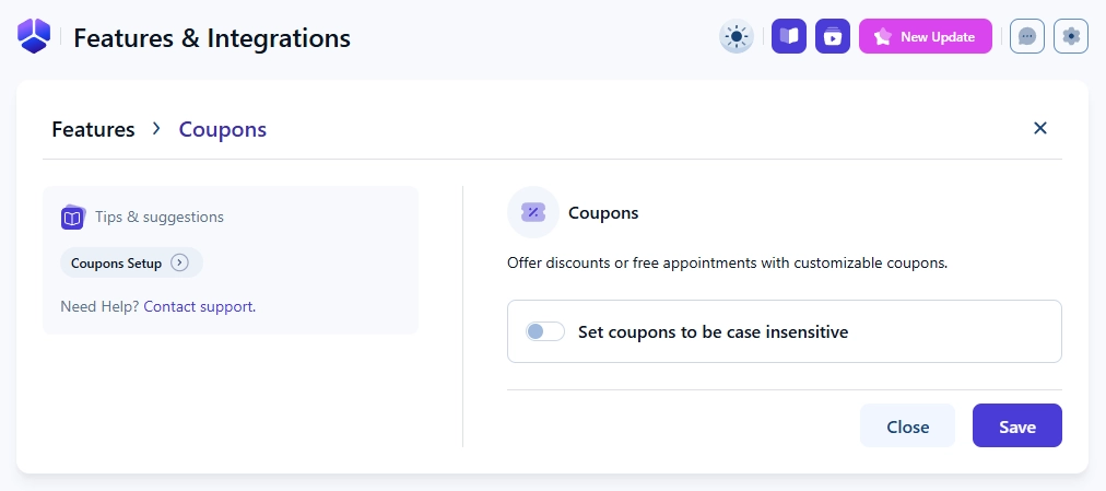 You can enable coupons by opening Amelia → Features & Integrations → Features and activating the Coupons feature. Once enabled, the Enable button becomes Disable, and a Set up button appears next to it. Selecting Set up opens a single option called Set coupons to be case insensitive, which defines whether uppercase and lowercase characters need to match exactly when customers enter coupon codes during booking.
