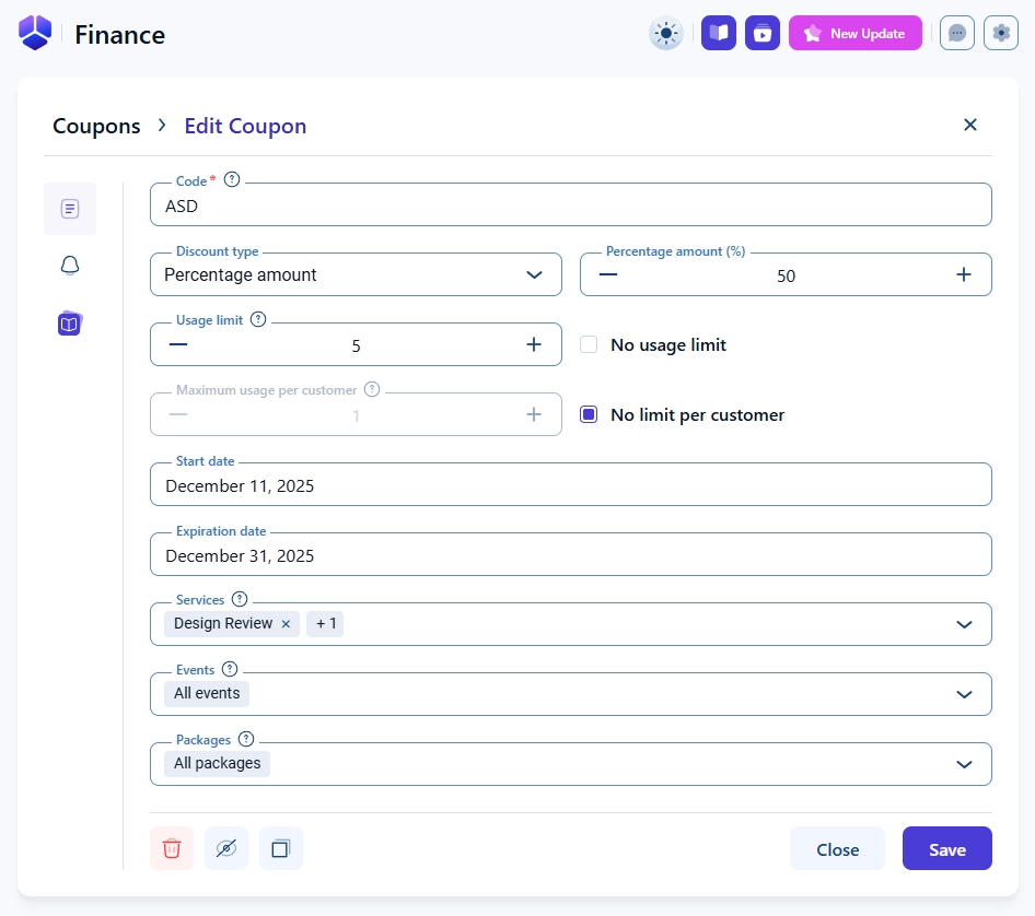 Coupons can be assigned to specific Services, Events, or Packages by selecting them from the dropdown menus. If you want the coupon to apply to everything, select the ALL option instead of manually selecting each item. Selecting all currently available items is not the same as selecting ALL, and newly created services, events, or packages will not be included unless ALL is chosen.