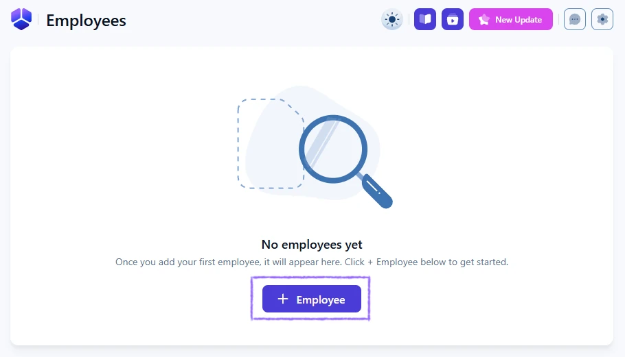After your first employee is created, the + Employee button is shown only in the top-right corner of the Employees list and is used for adding any additional employees.