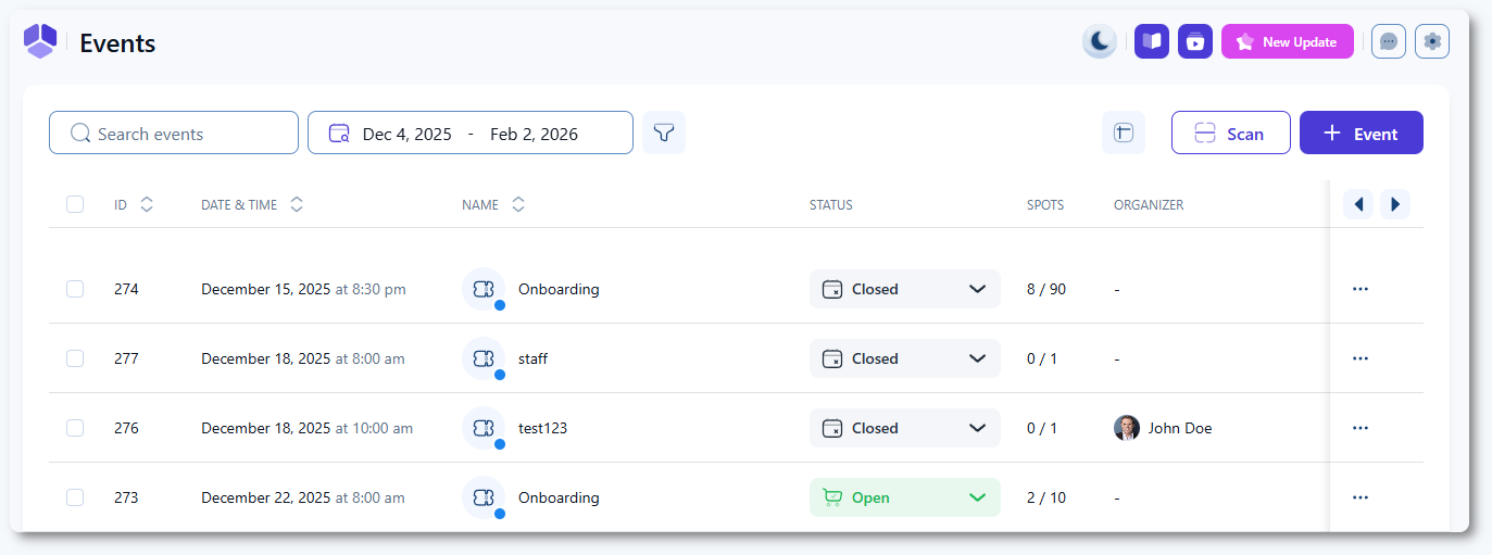 • Only one organizer can be assigned, but multiple staff members can be added.