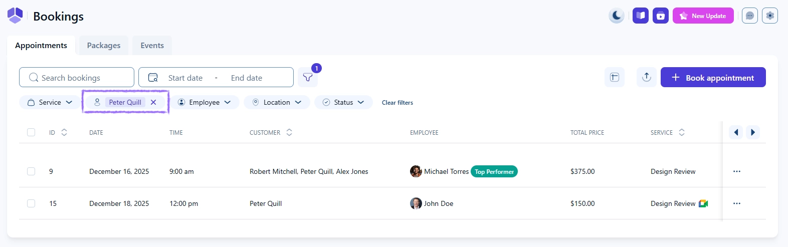 Customer activity provides a complete overview of all bookings associated with a specific customer. It helps you monitor their appointments, packages, and events in one place, making it easier to understand their history, preferences, and engagement over time.