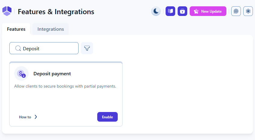 You can enable deposit payments in Features & integrations under the Features section. Activating the feature makes deposit options available on individual services, events, and packages, where you can configure the specific deposit type and amount.