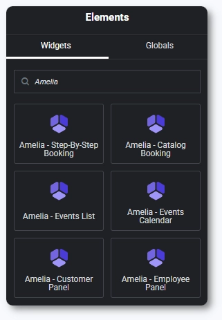 Open any page in Elementor and search for “Amelia” in the widgets panel, or scroll until you reach the Amelia section. The available widgets include all booking forms as well as the Customer and Employee panels.