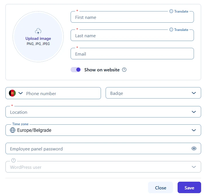 - Timezone – lets you set a different time zone for the employee if they work in a different region from your WordPress site. If this field is left empty, the employee uses the site’s time zone. The overall time zone behavior is explained in the dedicated time zone documentation.