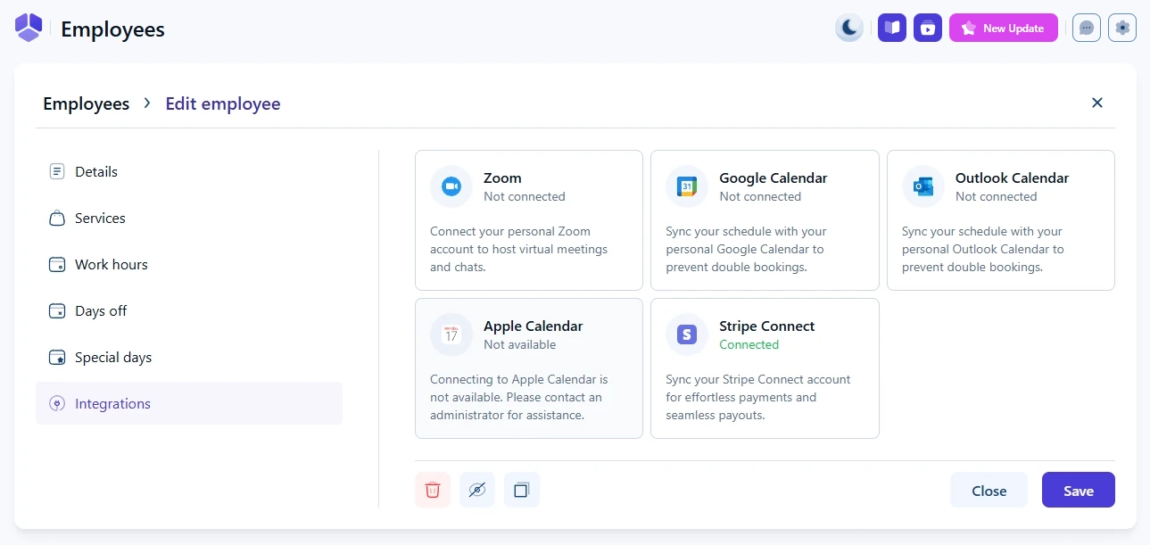The Integrations tab in the employee profile is where each employee connects their own external tools, such as calendars, Zoom, and Stripe. These connections control where appointments are synced, how online meetings are created, and which account receives payouts.