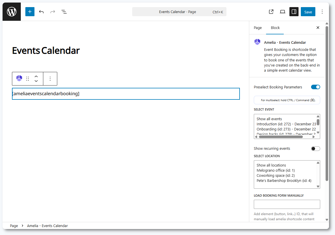 The builders mentioned above include Amelia blocks/widgets. Simply search for “Amelia”, select Events calendar, and publish the page. You can also preselect parameters such as a specific event, recurring events, a location, or a tag. These settings update the shortcode automatically in the editor.