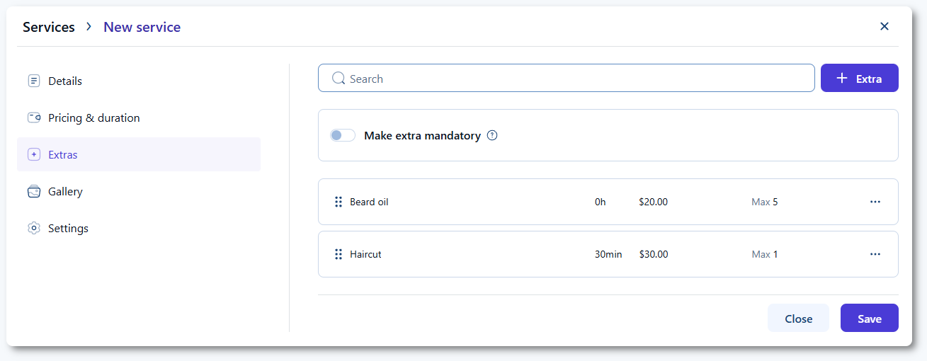 Extras let you offer optional add-ons that customers can include when booking a service, while the gallery allows you to upload images that visually introduce your service. Both options help personalize your services and improve the booking experience.