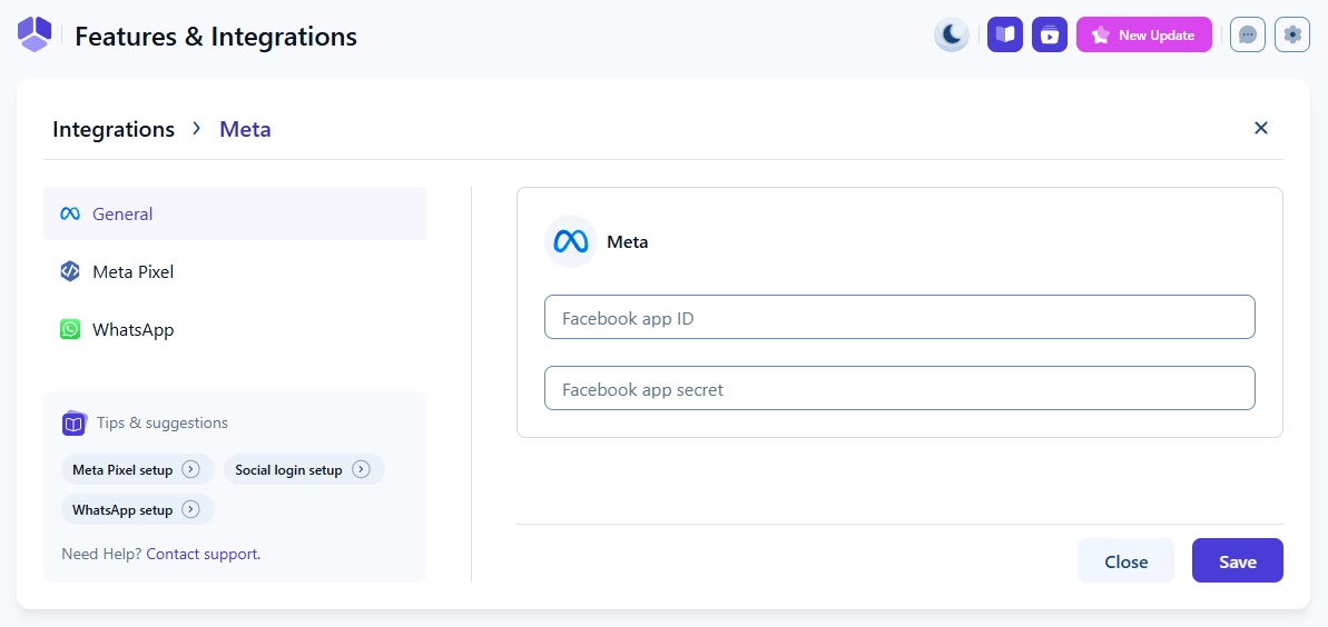 Open Features & integrations → Integrations and enable the Facebook social login feature. Click Set up to open Amelia’s Meta settings page, where you will add the App ID and App secret from your Meta Developer account.