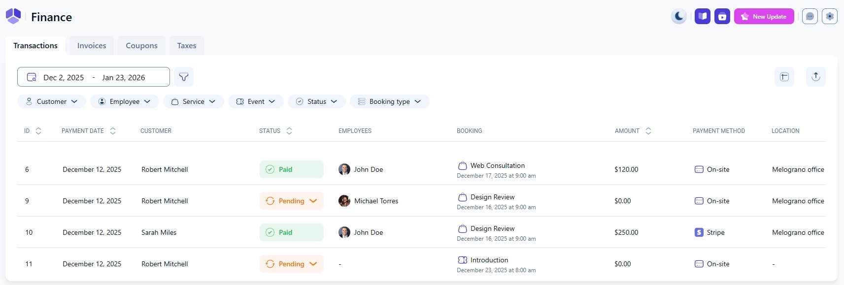 The Finance section in Amelia gives you a centralized overview of all financial data related to your bookings. From here, you can review transactions, manage invoices, and, if enabled, work with coupons and taxes. Each tab is optimized for a specific type of financial data and includes its own filters and table customization options.