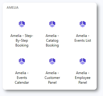 Search for “Amelia” and the available Amelia blocks will appear. Select the form you want to add, such as the Step by step booking form, the Catalog form, the Event list or Event calendar form, or the Customer or Employee panel.