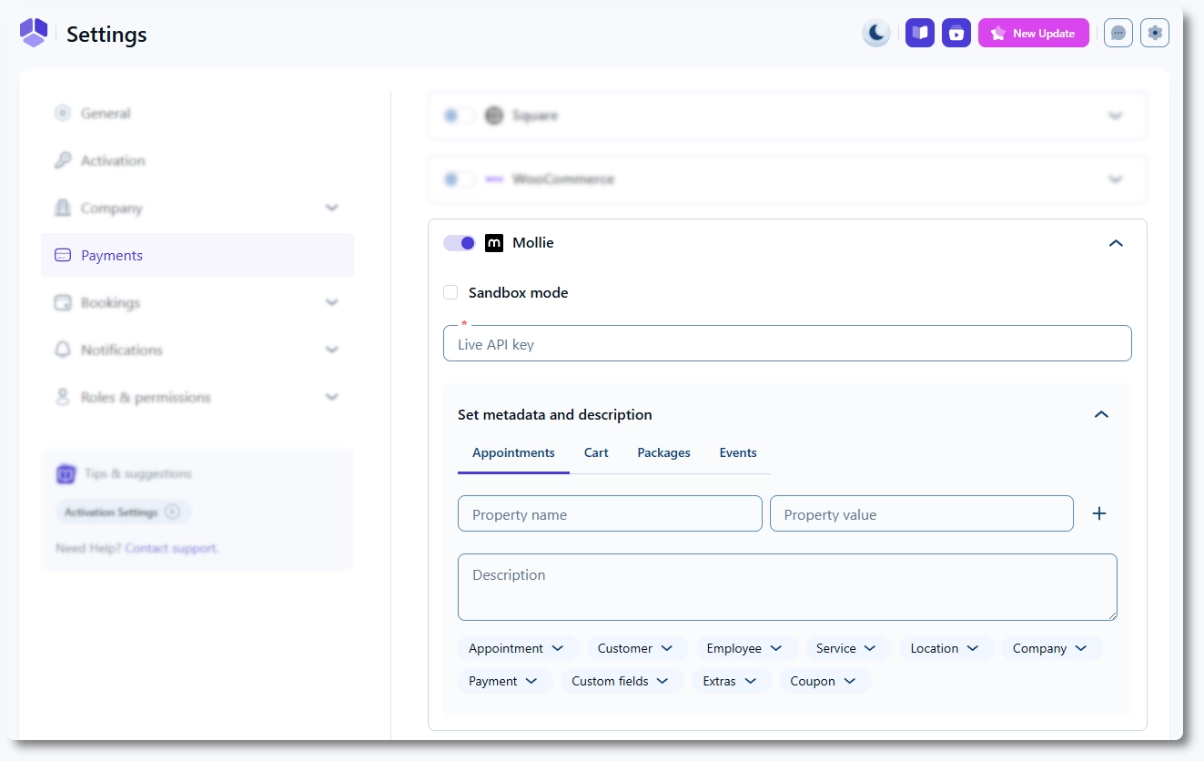 Mollie payments can be used for appointments, cart bookings, packages, and events, and are processed securely through Mollie’s checkout.