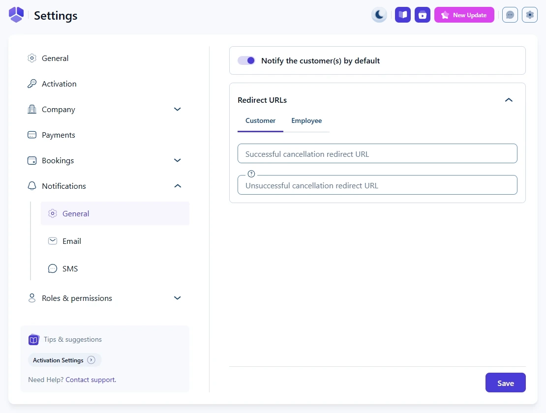 General notification settings let you decide whether Amelia sends notifications automatically and define where customers and employees are redirected after actions like cancellations, approvals, and rejections. This section includes a set of custom redirect URL fields for both customers and employees.