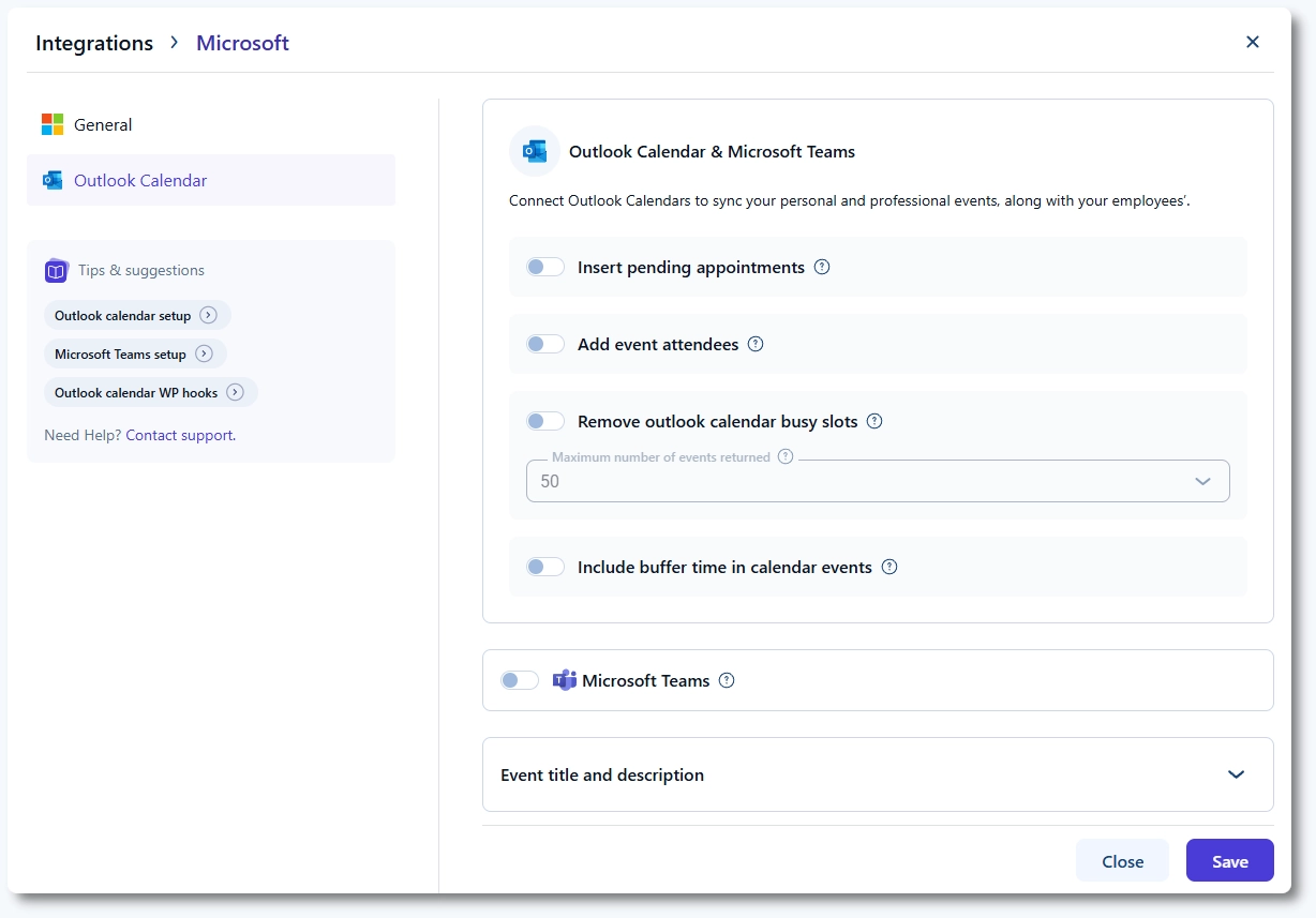 All Outlook Calendar settings are managed from the Outlook Calendar tab after enabling the integration in Features & Integrations → Integrations and clicking Set up.
