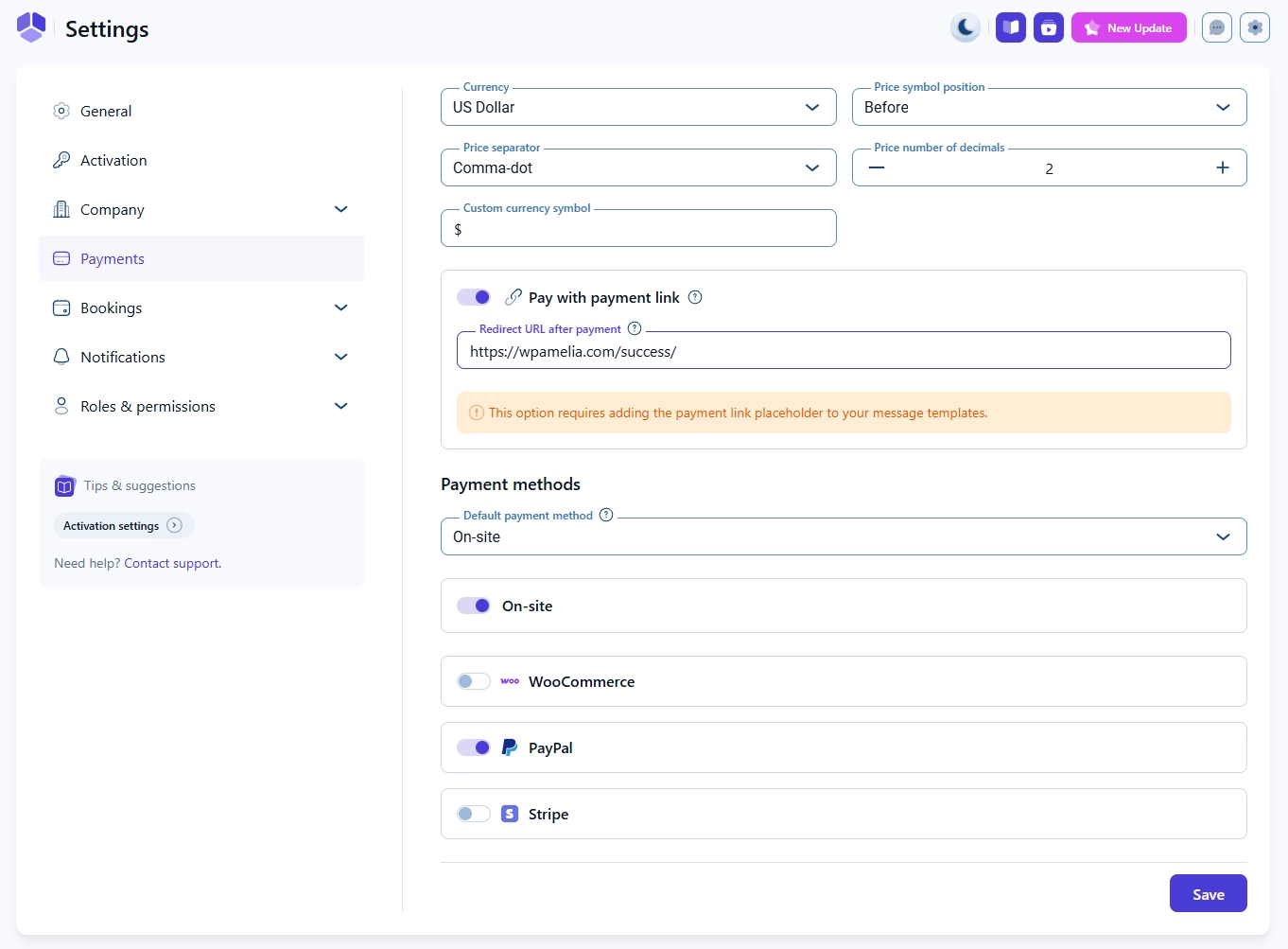 The Payment settings page controls your currency, price formatting, payment link behavior, and which payment methods are available for customers when booking through Amelia.