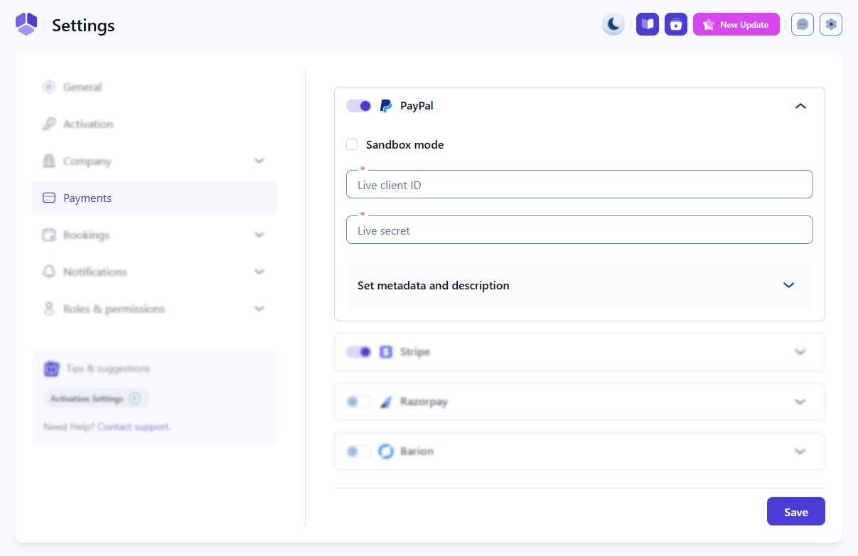 You can enable PayPal by turning it on in Amelia’s integrations and then configuring it in the Payments settings.