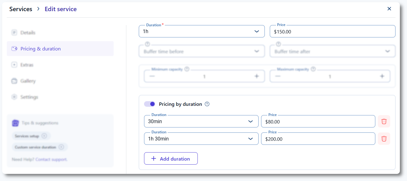 The pricing by duration option allows you to offer a single service with multiple durations that customers can choose from. You can define different prices for each duration and configure different prices for those durations per employee.