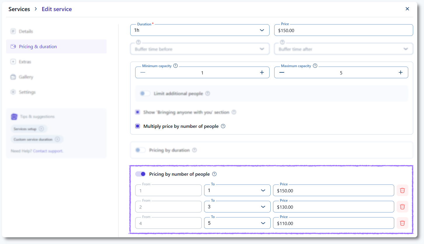 Pricing by number of people allows you to define different prices depending on how many people attend a service. This lets you create tiered group pricing, offer discounts for larger groups, and adjust your service cost based on total participant count.