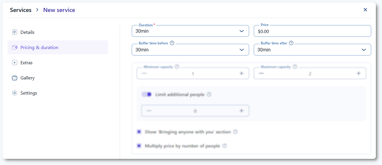 The Pricing & duration tab defines how long a service lasts, how many people can attend a single appointment, and how its price is calculated. These settings directly affect your available time slots, employee schedules, and the booking flow customers see on your website.
