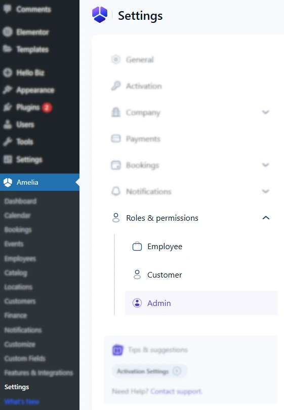 To open these settings, go to Amelia → Settings → Roles & permissions. You will see three sections in the left sidebar: Employee, Customer, and Admin. Each section has its own page with booking rules and panel access options.