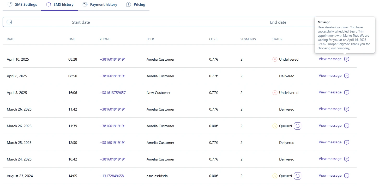 The SMS history tab shows every SMS message Amelia attempted to send through your SMS account. Each entry includes the message text, recipient number, sending date and time, and the latest delivery status returned by the mobile carrier.