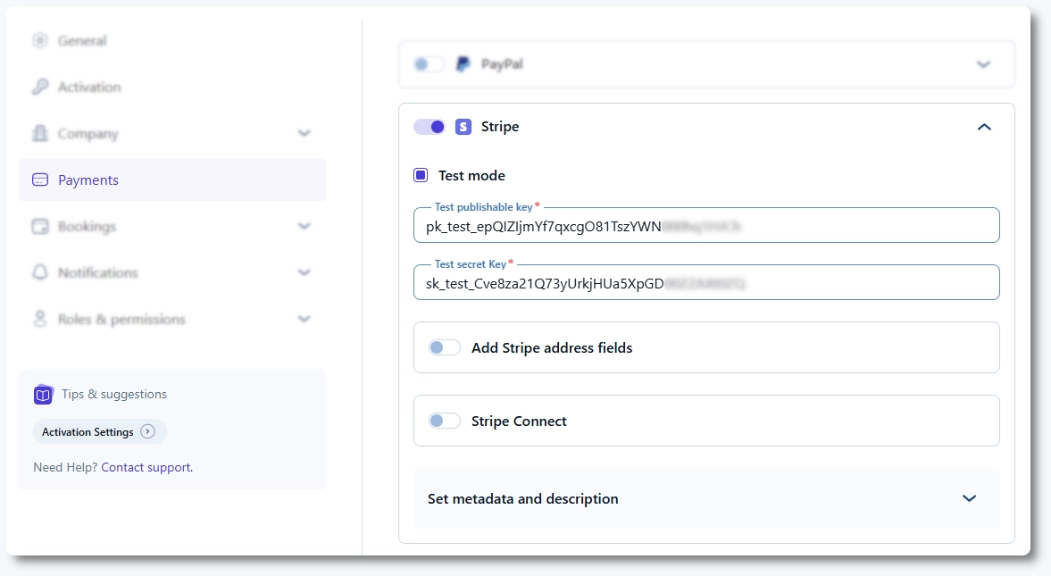 The Set metadata and description option lets you control what booking information is sent to Stripe with each payment.