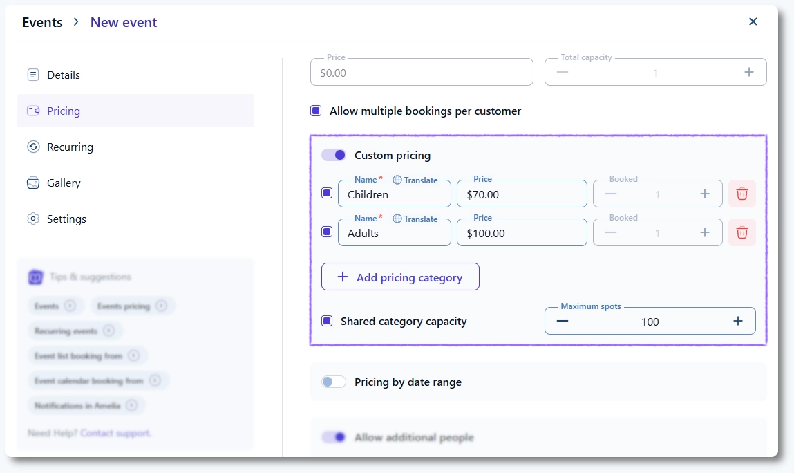 You can create additional categories by selecting + Add pricing category. Each category can be independently priced and shown on the booking form.