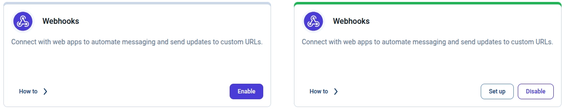 You can enable Webhooks from Amelia → Features & Integrations → Features by clicking Enable on the Webhooks card, after which the Set up and Disable buttons become available for managing the feature.