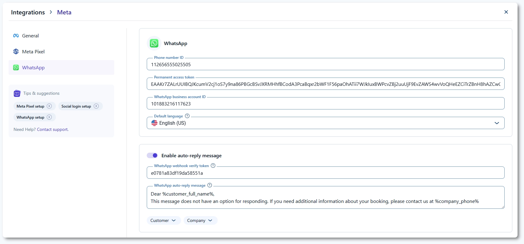 Enter a reply message in the WhatsApp auto-reply message field. You can use placeholders such as %customer_full_name% or %company_phone% to personalise the message. This message is sent once per customer reply, regardless of which notification they responded to.