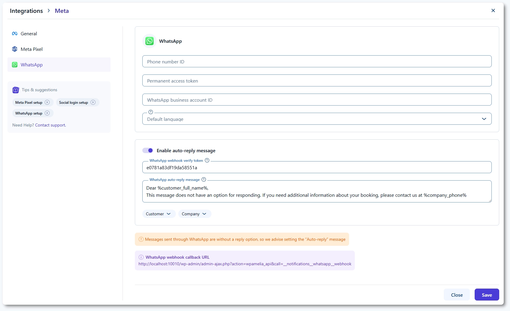WhatsApp notifications are template-based, which means all message content must come from an approved template in your Meta Business Manager account. Amelia cannot send custom text or freeform replies. Only one auto-reply can be configured in Amelia, and it is sent when a customer responds to any WhatsApp message.